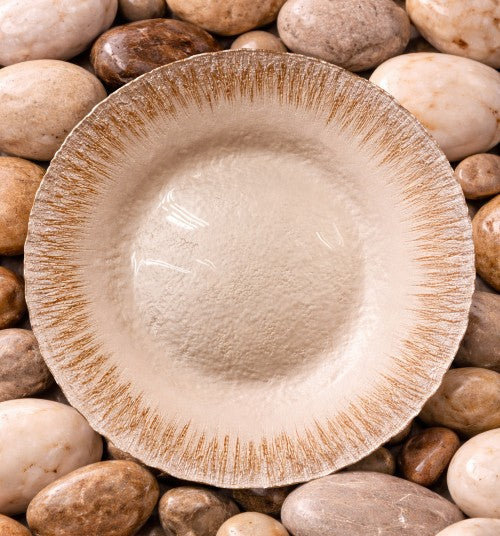 Description: Elegant glass charger plate featuring a soft rose blush tone with a textured icicle rim that adds warmth and refined sparkle to any table setting. dishwasher-safe and durable, ideal for weddings, upscale events, hospitality settings, and coordinated table presentations.
