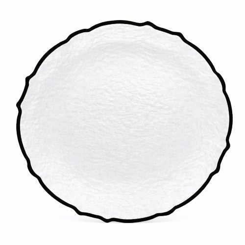 Add a dramatic edge to your table setting with this 13-inch Black Scalloped Glass Rim Charger Plate. Featuring a clear textured glass base and a bold black scalloped rim, this charger delivers a modern-meets-vintage aesthetic—perfect for chic weddings, black-tie events, or monochromatic themes.