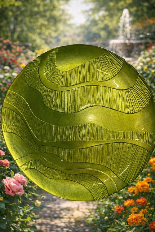 Description: Elegant glass charger plate featuring a flowing wave design in a soft sage green finish, adding movement and a calming, modern touch to any table setting. dishwasher-safe and durable, ideal for weddings, upscale events, hospitality settings, and refined table presentations.