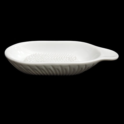 Description: This 6x2.5-inch white oval dish features a textured grater center and a convenient handle, perfect for grating and serving ginger, garlic, or other fresh condiments. Ideal for home kitchens, restaurants, and professional food preparation.