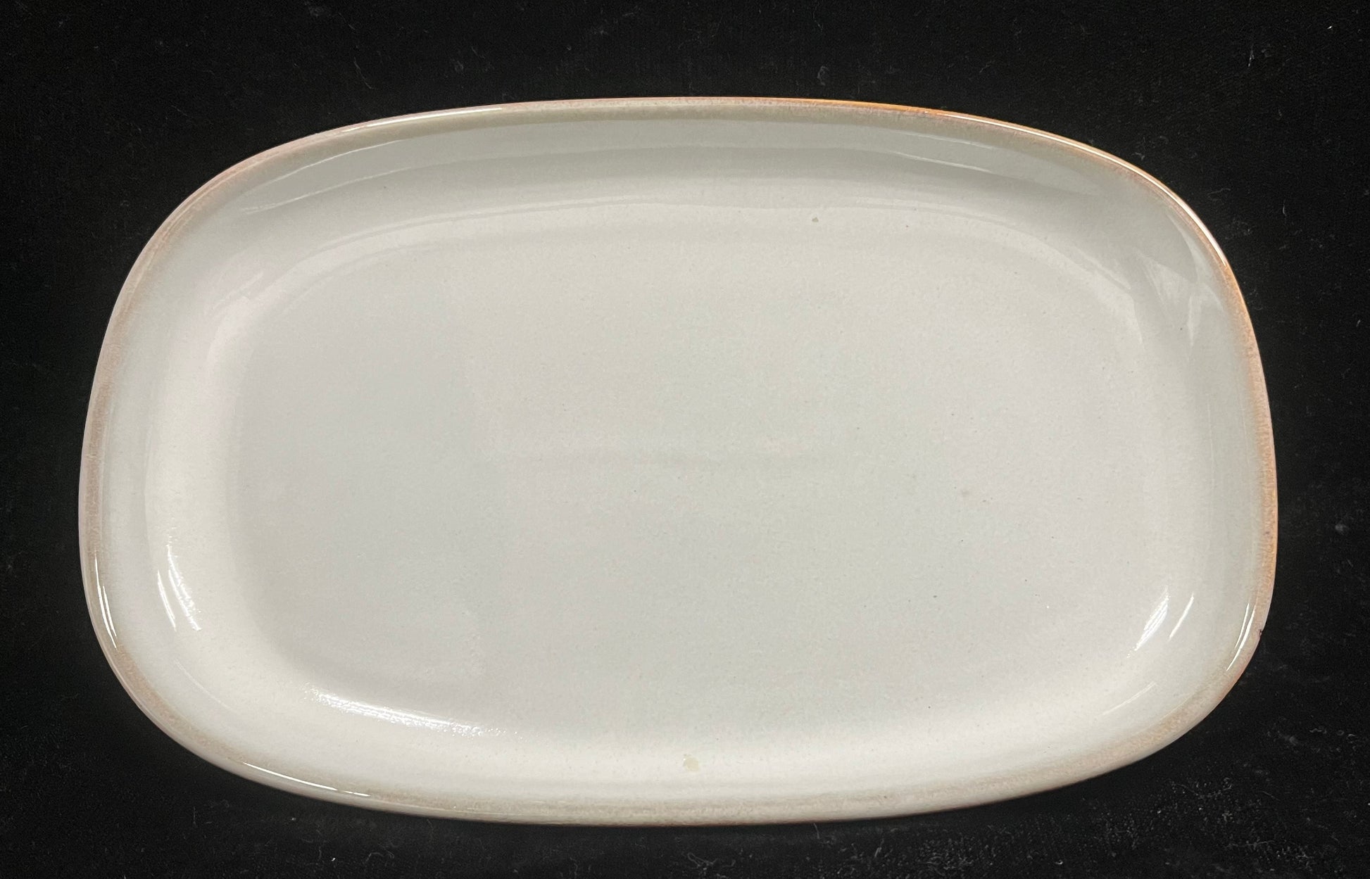 Description: A rectangular porcelain plate with softly rounded edges and a smooth neutral glaze accented by a faint rustic rim. Its versatile shape makes it ideal for serving appetizers, sushi, or desserts with a modern presentation.